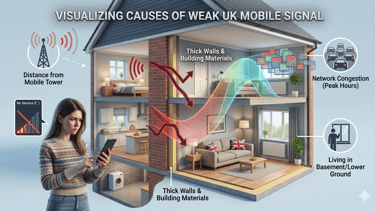 You may experience weak mobile signal at home due to poor mobile network coverage UK, thick walls, distance from towers, or network congestion. These factors can lead to poor mobile reception and unstable connections indoors.