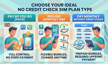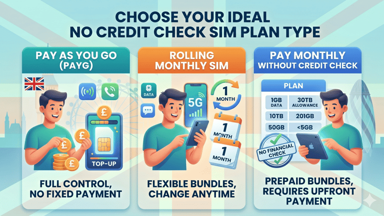Common options include pay as you go sim uk, rolling monthly sim, and some pay monthly sim no credit check plans. All of these fall under no credit check SIM only deals.